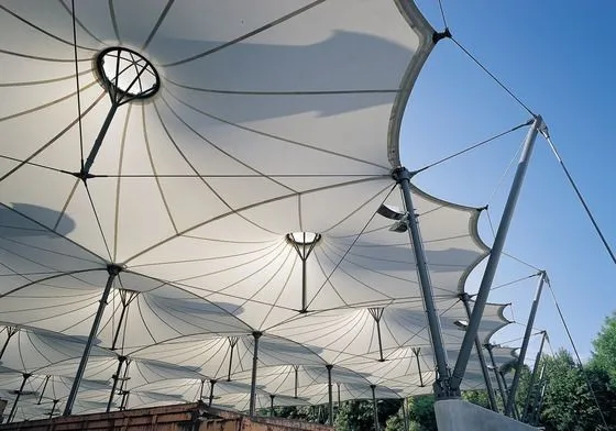 مظلات الشد الإنشائي :هي هياكل تعتمد على توتير أو "شد" غشاء مرن وقوي (قماش أو غشاء صناعي) على إطار أو هيكل معدني، يتم تثبيته بواسطة كابلات وأوتاد فولاذية قوية. يضمن هذا الشد توزيع الأحمال بكفاءة فائقة، مما يجعل الهيكل قادراً على تحمل: