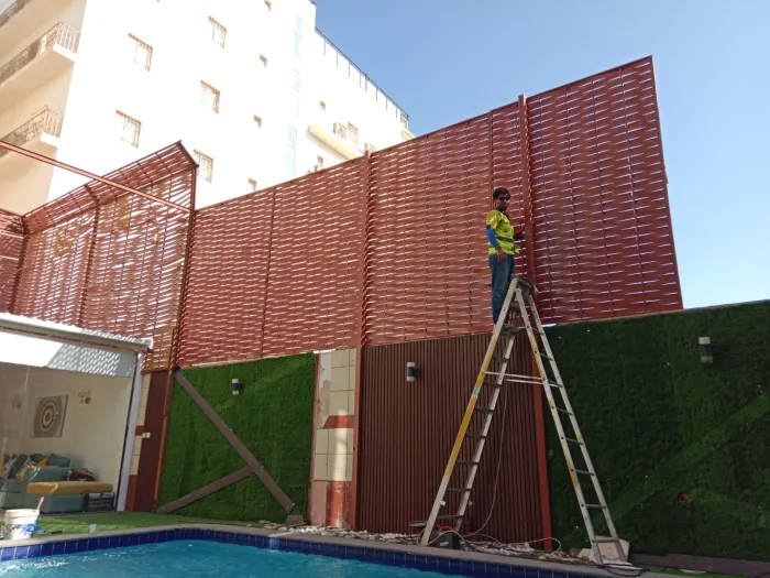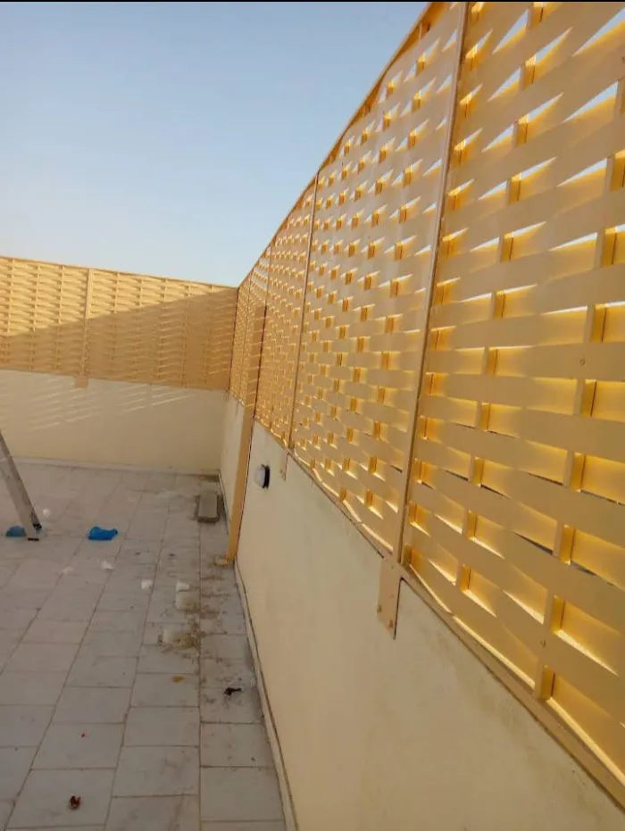 السواتر الخشبية:- المجدول: يوفر تهوية جيدة مع حجب الرؤية بزاوية مائلة، مما يمنح مظهراً فخماً وعصرياً.
